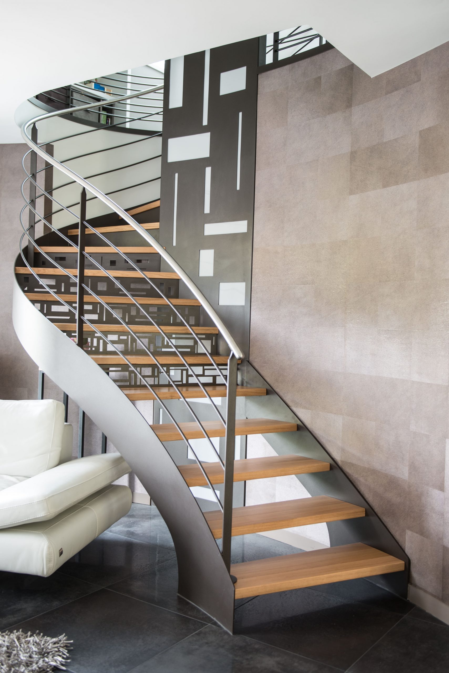 Création pour la maison d’un particulier. Le volume de la pièce a permis la réalisation de cet escalier balancé aux courbes élégantes. Le métal et les ajourements des contre-marches sélectionnées contribuent au design contemporain de l’ouvrage. Les marches bois lui confèrent plus de chaleur pour un intérieur cosy. La paroi métallique en applique du mur rappelle le motif des contre-marches et est dotée d’un éclairage.
