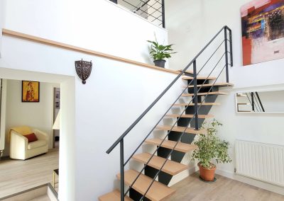 Pour rendre accessible la mezzanine après la rénovation de sa maison, notre cliente souhaitait un escalier esthétique, chaleureux et avec un encombrement limité. La longueur des marches a ainsi été adaptée. A l’étage le garde-corps est assorti à la rampe métal de l’escalier. La structure acier est peinte en gris anthracite (technique thermolaquage). Un platelage bois a également été découpé sur-mesure, dans la même essence que les marches dans le but d’habiller le retour de mur longeant l’escalier.